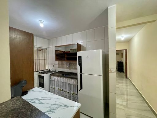 Conta com garagem para dois carros, sala ampla, bem iluminada, integrada à cozinha, criando um ambiente prático e aconchegante para o dia a dia. Dispõe ainda de banheiro social, dois quartos bem distribuídos e área de serviço independente.